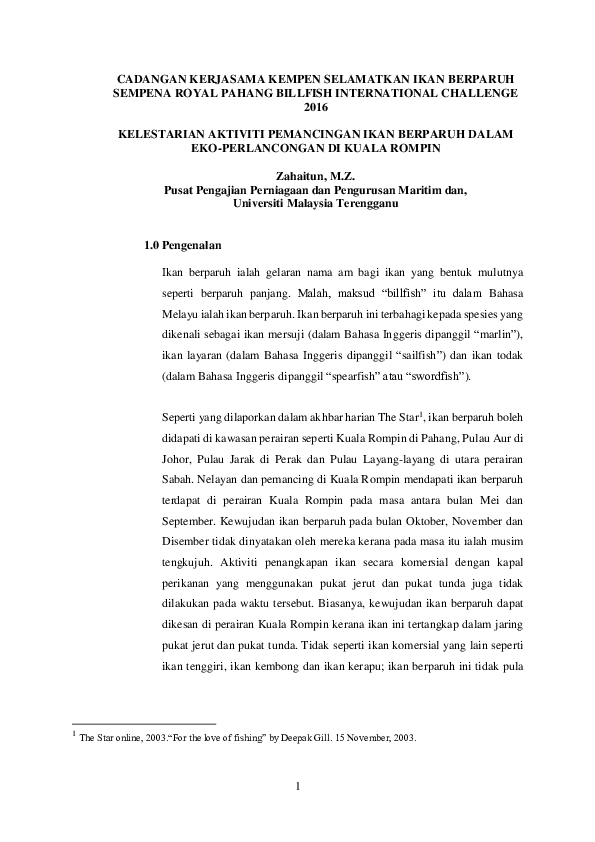 Doc Cadangan Kerjasama Kempen Selamatkan Ikan Berparuh Sempena Royal Pahang Billfish International Challenge 2016 Zahaitun Mahani Zakariah Academia Edu